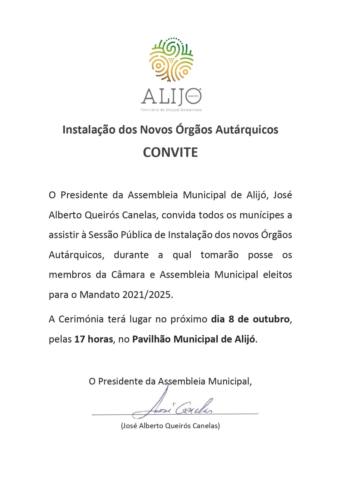 A Cerimónia de Instalação dos novos Órgãos Autárquicos, durante a qual tomarão posse os membros da Câmara e Assembleia Municipal eleitos para o Mandato 2021/2025, terá lugar no próximo dia 8 de outubro, pelas 17 horas, no Pavilhão Municipal de Alijó.