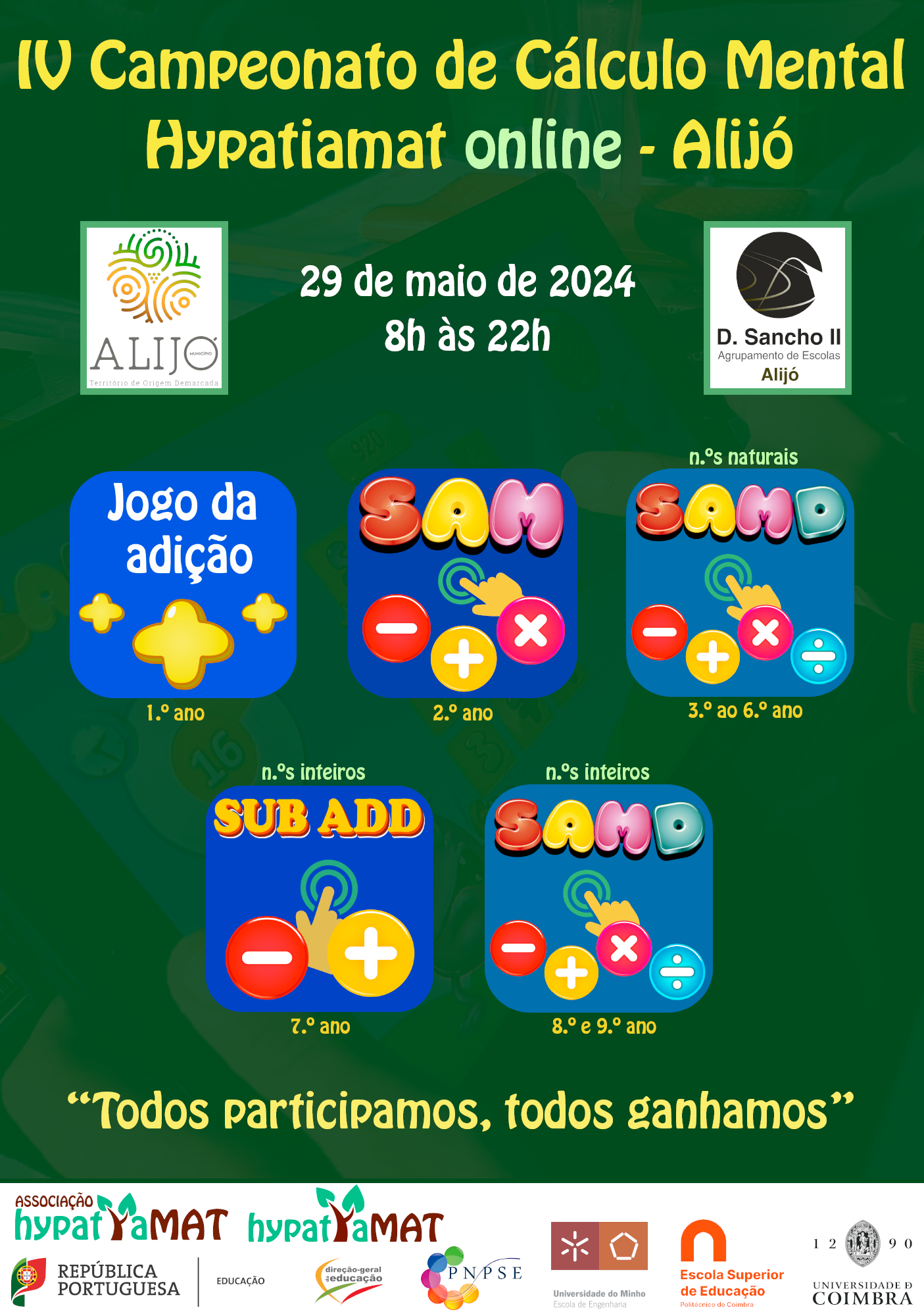 Os alunos do Ensino Básico do Agrupamento de Escolas D. Sancho II - Alijó vão hoje participar no V Campeonato de Cálculo Mental Hypatiamat Online. O Município de Alijó deseja as maiores felicidades a todos os participantes, que representam o Concelho de Alijó.