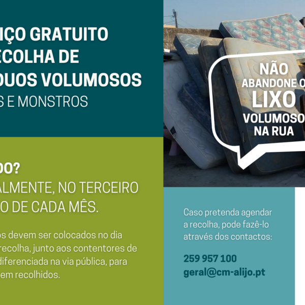 O Município de Alijó disponibiliza aos seus munícipes, de forma totalmente gratuita, um Serviço de Recolha de Resíduos Volumosos. As recolhas são realizadas mensalmente, no terceiro sábado de cada ...04 Maio 2022