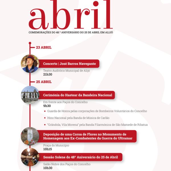 O Município de Alijó vai promover um conjunto de atividades para assinalar o 48º aniversário da Revolução do 25 de abril, cujo programa terá início a 23 de abril com um concerto de José Barros ...18 Abril 2022 -