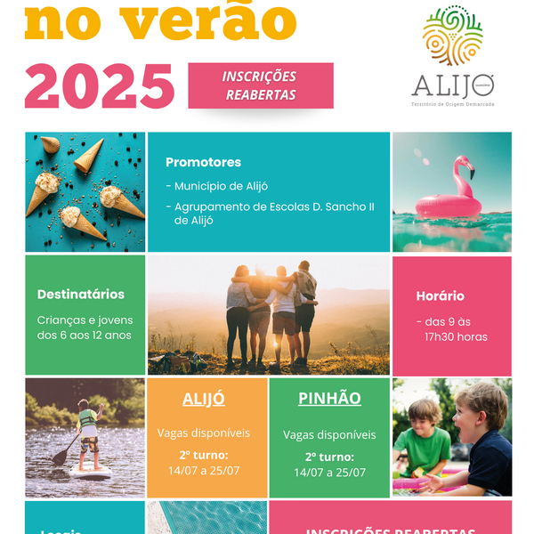 O Município de Alijó informa que foram reabertas, até ao dia 06 de julho, as inscrições para o 2.º turno do programa MOVE(te) no verão, a decorrer entre os dias 14 e 25 de julho, em Alijó e no ...02 Julho 2025 -