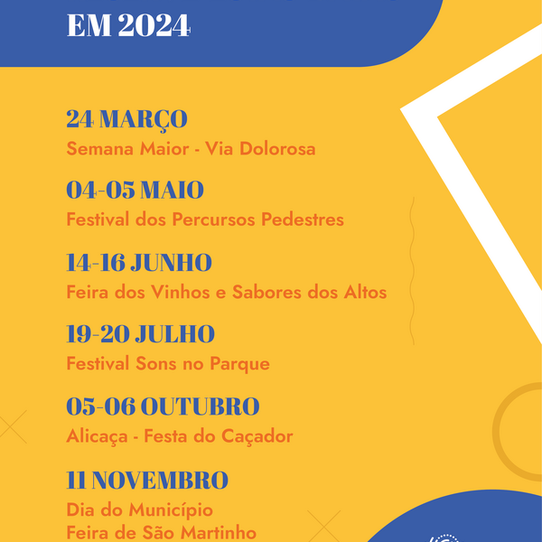 O Município de Alijó lança as datas dos grandes eventos programados para o ano de 2024: Via Dolorosa, Festival dos Percursos Pedestres, Alicaça - Festa do Caçador, Feira dos Vinhos e Sabores dos ...30 Janeiro 2024 -
