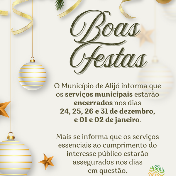 O Município de Alijó informa que os serviços municipais estarão encerrados nos próximos dias 24, 25, 26 e 31 de dezembro, e ainda 01 e 02 de janeiro. Mais se informa que os serviços essenciais ao ...23 Dezembro 2025
