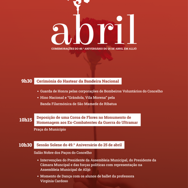 O Município de Alijó volta a assinalar um dos momentos mais importantes da história do nosso País com um programa de atividades aberto a toda a população, no dia 25 de abril. As comemorações do ...16 Abril 2023 -
