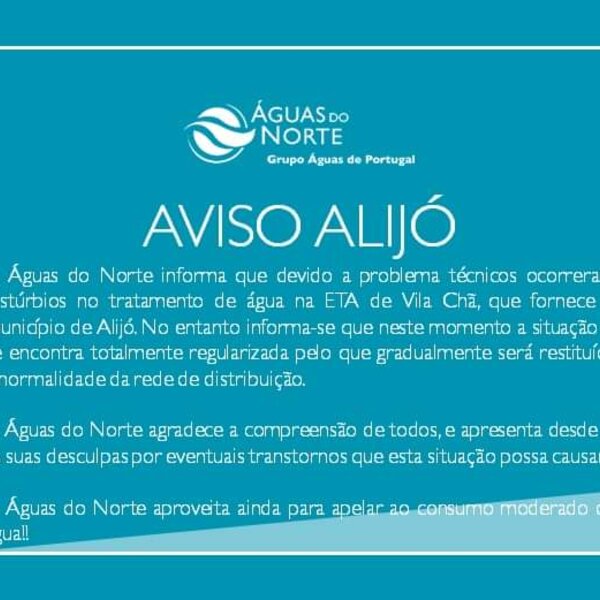 O Município de Alijó divulga o comunicado da Águas do Norte que dá conta de que estão regularizados os problemas técnicos que têm afetado a Estação de Tratamento de Água (ETA) de Vila Chã, que ...22 Setembro 2022