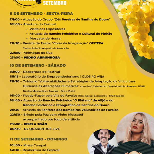 Em plena época de vindimas, o Festival Moscatel do Douro está de regresso à vila de Favaios, no Concelho de Alijó, de 9 a 11 de setembro. A animação do evento dedicado ao melhor Moscatel do País ...31 Agosto 2022 -